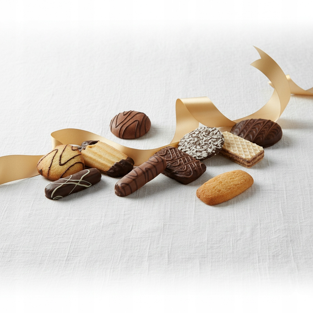 ✓ Niezrównana Różnorodność Smaków: W jednym pudełku znajdziesz aż 11 unikalnych kompozycji – od delikatnych ciastek maślanych, przez te z nutą kokosa i marcepanu, aż po intensywnie czekoladowe arcydzieła.
